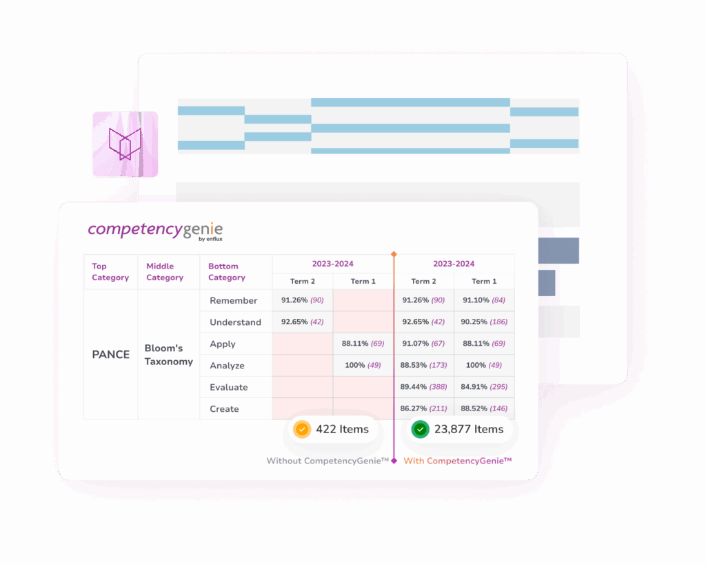 Enflux’s AI-powered CompetencyGenie™ and curriculum mapping tools streamline exam tagging and curriculum alignment, making it easier to track competencies, student learning outcomes, and trends across cohorts.