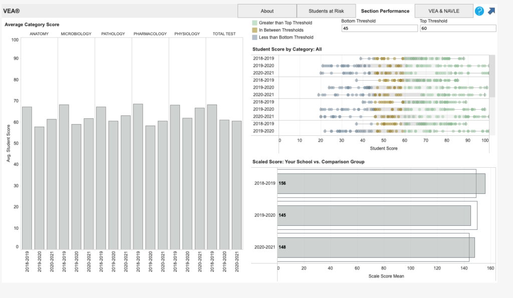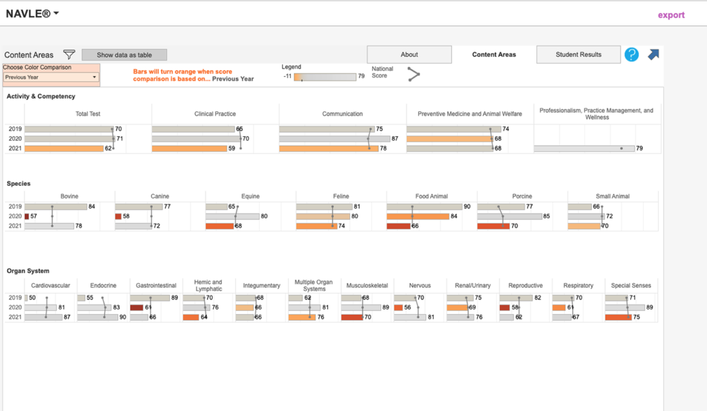 Efficiently analyze Veterinary Educational Assessment data to track and compare your students’ long-term performance, inform curriculum adjustments, and assist in their NAVLE preparation.